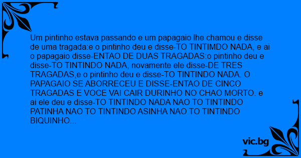 Um pintinho estava passando e um papagaio lhe chamou e disse de uma tragada:e o pintinho deu e disse-TO TINTIMDO NADA, e ai o papagaio disse-ENTAO DE DUAS TRAGADAS:o pintinho deu e disse-TO TINTINDO NADA, novamente ele disse-DE TRES TRAGADAS,e o pintinho deu e disse-TO TINTINDO NADA. O PAPAGAIO SE ABORRECEU E DISSE-ENTAO DE CINCO TRAGADAS E VOCE VAI CAIR DURINHO NO CHAO MORTO. e ai ele deu e disse-TO TINTINDO NADA NAO TO TINTINDO PATINHA NAO TO TINTINDO ASINHA NAO TO TINTINDO BIQUINHO...