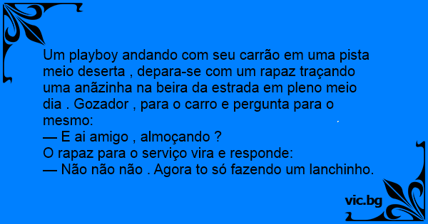 Um рlаyвоy andando com seu carrão em uma pista meio deserta , depara-se com um rapaz traçando uma anãzinha na beira da estrada em pleno meio dia . Gozador , para o carro e pergunta para o mesmo: