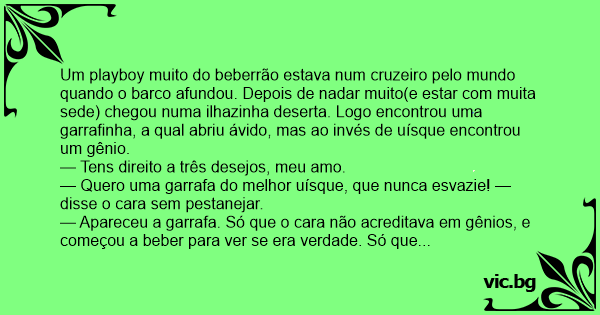 Um рlаyвоy muito do beberrão estava num cruzeiro pelo mundo quando o barco afundou. Depois de nadar muito(e estar com muita sede) chegou numa ilhazinha deserta. Logo encontrou uma garrafinha, a qual abriu ávido, mas ao invés de uísque encontrou um gênio.