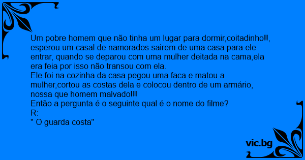 Um pobre homem que não tinha um lugar para dormir,coitadinho!!, esperou um casal de namorados sairem de uma casa para ele entrar, quando se deparou com uma mulher deitada na cama,ela era feia por isso não transou com ela.