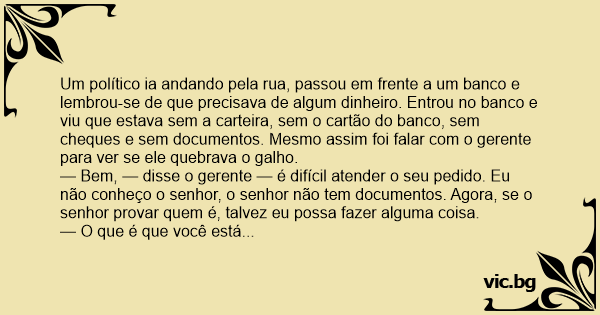 Um político ia andando pela rua, passou em frente a um banco e lembrou-se de que precisava de algum dinheiro. Entrou no banco e viu que estava sem a carteira, sem o cartão do banco, sem cheques e sem documentos. Mesmo assim foi falar com o gerente para ver se ele quebrava o galho.