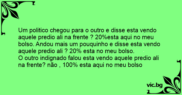 Um politico chegou para o outro e disse esta vendo aquele predio ali na frente ? 20%esta aqui no meu bolso. Andou mais um pouquinho e disse esta vendo aquele predio ali ? 20% esta no meu bolso.