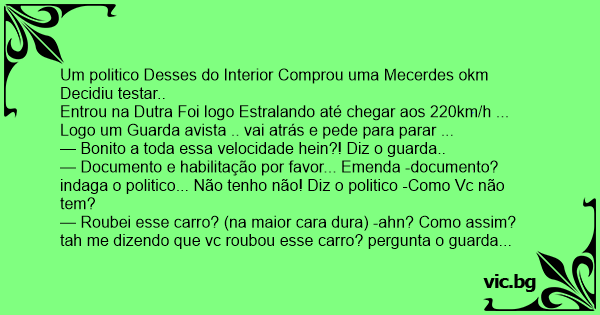— Boa tarde!(comandante) -Boa tarde!(politico) -Documento do carro por favor!?(comantante) -Claro aqui está!(politico) -pera ae? Tah no seu nome(cmnt) -ue claro o carro e meu!(plti) -Abre o porta luva por favor ! Ele Abre VAZIO!(cmnt) -abre o porta mala por favor ! ele abre Vazio(cmnt) - Olha senhor axo que ha algo errado aqui... Pois o guarda disse que vocÊ roubou esse carro matou o maotoirsta e que ele está no seu porta mala... e que vc tem uma arma no porta luva!(cmnt) -Olha seu policial esse guarda deve tar louco.. tadinho...