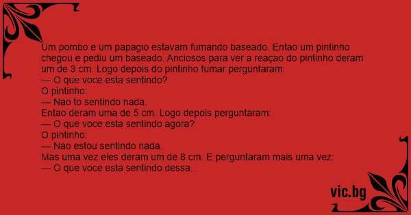 Um pombo e um papagio estavam fumando baseado. Entao um pintinho chegou e pediu um baseado. Anciosos para ver a reaçao do pintinho deram um de 3 cm. Logo depois do pintinho fumar perguntaram:
