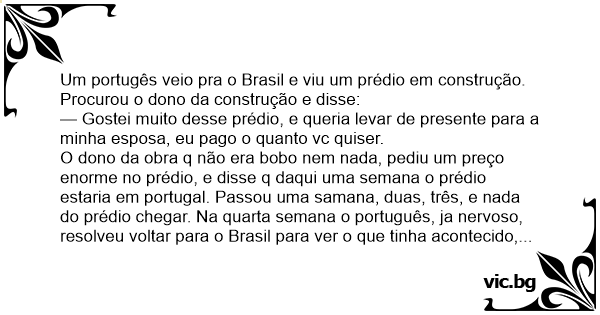 O dono da obra q não era bobo nem nada, pediu um preço enorme no prédio, e disse q daqui uma semana o prédio estaria em portugal. Passou uma samana, duas, três, e nada do prédio chegar. Na quarta semana o português, ja nervoso, resolveu voltar para o Brasil para ver o que tinha acontecido, chegando aqui, ele viu q o prédio estava cercado por uma rede, e pensou: