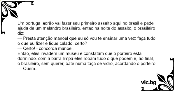 Um portuga ladrão vai fazer seu primeiro assalto aqui no brasil e pede ajuda de um malandro brasileiro. entao,na noite do assalto, o brasileiro diz: