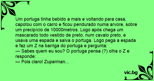 Um portuga tinha bebido a mais e voltando para casa, capotou com o carro e ficou pendurado numa arvore, sobre um precipício de 10000metros. Logo após chega um mascarado todo vestido de preto, num cavalo preto, e usava uma espada e salva o portuga. Logo pega a espada e faz um Z na barriga do portuga e pergunta: