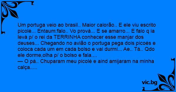 Um portuga veio ao brasil.. Maior calorão.. E ele viu escrito picolé... Entaum:falo.. Vo prová... E se amarro... E falo q ia levá p/ o rei da TERRINHA conhecer esse manjar dos deuses... Chegando no avião o portuga pega dois picoés e coloca cada um em cada bolso e vai durmi... Ae.. Tá.. Qdo ele dorme,olha p/ o bolso e fala....