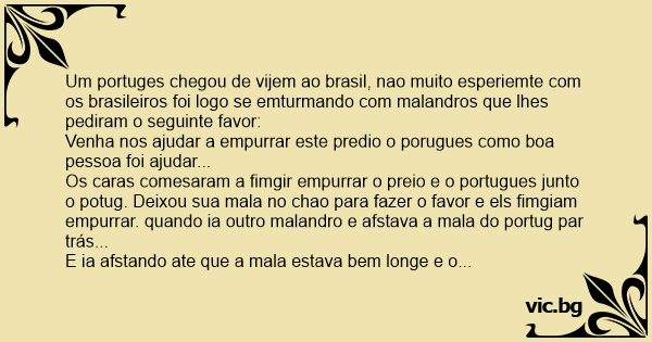 Um portuges chegou de vijem ao brasil, nao muito esperiemte com os brasileiros foi logo se emturmando com malandros que lhes pediram o seguinte favor: