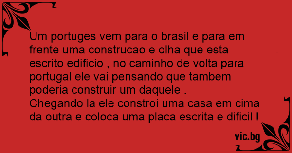 Um portuges vem para o brasil e para em frente uma construcao e olha que esta escrito edificio , no caminho de volta para portugal ele vai pensando que tambem poderia construir um daquele .