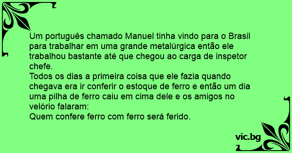 Um português chamado Manuel tinha vindo para o Brasil para trabalhar em uma grande metalúrgica então ele trabalhou bastante até que chegou ao carga de inspetor chefe.