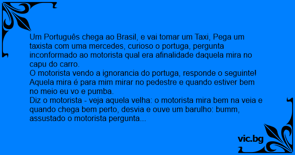 Um Português chega ao Brasil, e vai tomar um Taxi, Pega um taxista com uma mercedes, curioso o portuga, pergunta inconformado ao motorista qual era afinalidade daquela mira no capu do carro.