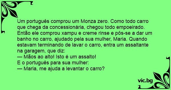 Um português comprou um Monza zero. Como todo carro que chega da concessionária, chegou todo empoeirado. Então ele comprou xampu e creme rinse e pôs-se a dar um banho no carro, ajudado pela sua mulher, Maria. Quando estavam terminando de lavar o carro, entra um assaltante na garagem, que diz: