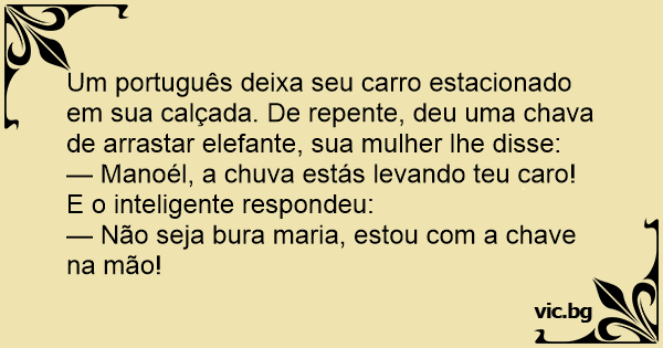 Um português deixa seu carro estacionado em sua calçada. De repente, deu uma chava de arrastar elefante, sua mulher lhe disse: