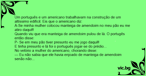 Um português e um americano trabalhavam na construção de um altíssimo edifícil. Eis que o americano diz: