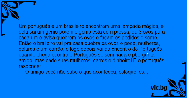 Então o braileiro vai pra casa quebra os ovos e pede, mulheres, dolares e um carrão, e logo depois vai ao encontro do Português quando chega econtra o Português só sem nada e p0ergunta amigo, mas cade suas mulheres, carros e dinheiro! E o português responde: