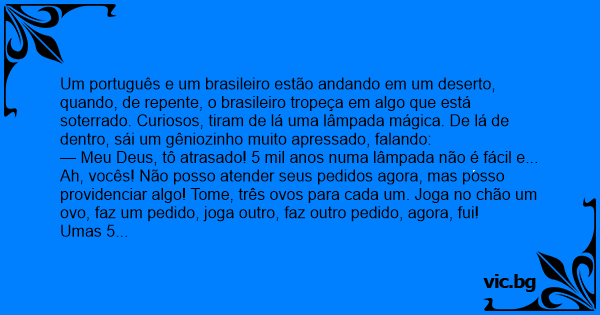 Um português e um brasileiro estão andando em um deserto, quando, de repente, o brasileiro tropeça em algo que está soterrado. Curiosos, tiram de lá uma lâmpada mágica. De lá de dentro, sái um gêniozinho muito apressado, falando: