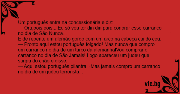 — Aqui estou português pilantra! -Mas jamais compro um carranco no dia de um judeu terrorista como você!Vou comprar o carranco no dia de São Não Mesmo!Dai apareceu um argentino e disse: