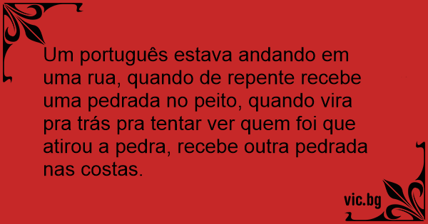 Um português estava andando em uma rua, quando de repente recebe uma pedrada no peito, quando vira pra trás pra tentar ver quem foi que atirou a pedra, recebe outra pedrada nas costas.