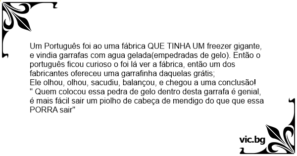 Um Português foi ao uma fábrica QUE TINHA UM freezer gigante, e vindia garrafas com agua gelada(empedradas de gelo). Então o português ficou curioso o foi lá ver a fábrica, então um dos fabricantes ofereceu uma garrafinha daquelas grátis;