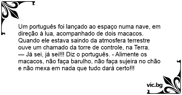 — Já sei, já sei!!! Diz o português. - Alimente os macacos, não faça barulho, não faça sujeira no chão e não mexa em nada que tudo dará certo!!!