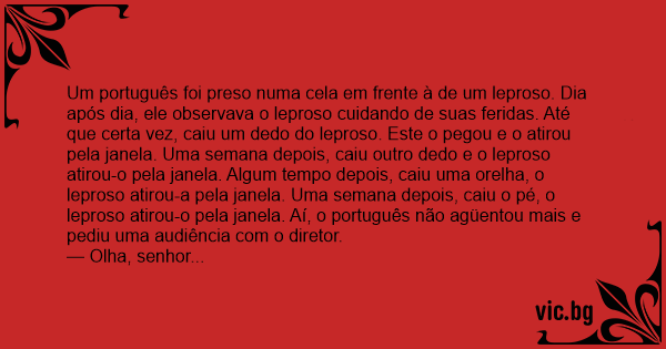 Um português foi preso numa cela em frente à de um leproso. Dia após dia, ele observava o leproso cuidando de suas feridas. Até que certa vez, caiu um dedo do leproso. Este o pegou e o atirou pela janela. Uma semana depois, caiu outro dedo e o leproso atirou-o pela janela. Algum tempo depois, caiu uma orelha, o leproso atirou-a pela janela. Uma semana depois, caiu o pé, o leproso atirou-o pela janela. Aí, o português não agüentou mais e pediu uma audiência com o diretor.