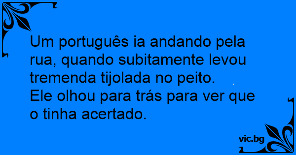 Um português ia andando pela rua, quando subitamente levou tremenda tijolada no peito.
