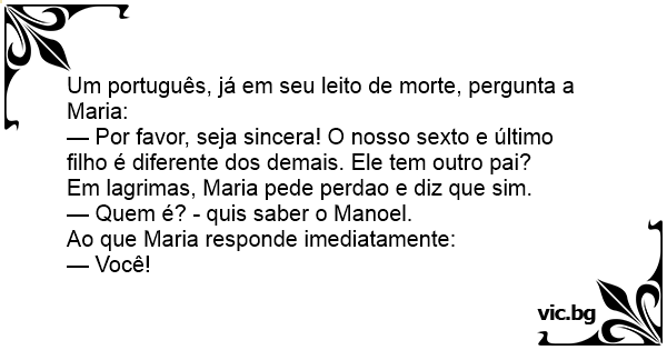 — Por favor, seja sincera! O nosso sexto e último filho é diferente dos demais. Ele tem outro pai?