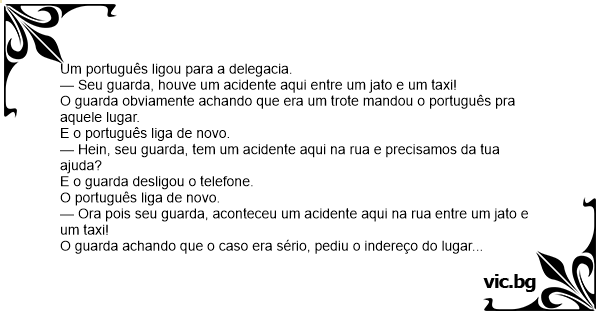 — Ora pois seu guarda, aconteceu um acidente aqui na rua entre um jato e um taxi!