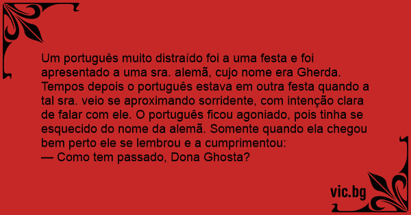 Um português muito distraído foi a uma festa e foi apresentado a uma sra. alemã, cujo nome era Gherda. Tempos depois o português estava em outra festa quando a tal sra. veio se aproximando sorridente, com intenção clara de falar com ele. O português ficou agoniado, pois tinha se esquecido do nome da alemã. Somente quando ela chegou bem perto ele se lembrou e a cumprimentou: