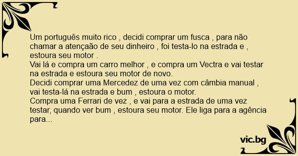 Um português muito rico , decidi comprar um fusca , para não chamar a atençaão de seu dinheiro , foi testa-lo na estrada e , estoura seu motor .