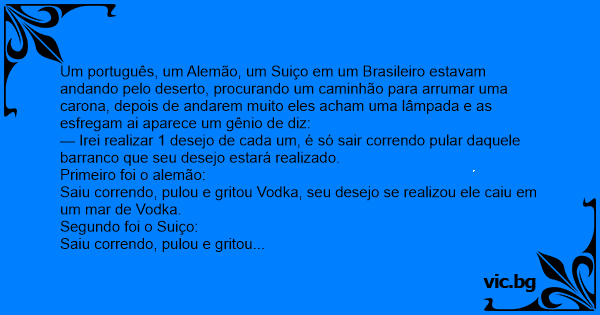 Um português, um Alemão, um Suiço em um Brasileiro estavam andando pelo deserto, procurando um caminhão para arrumar uma carona, depois de andarem muito eles acham uma lâmpada e as esfregam ai aparece um gênio de diz: