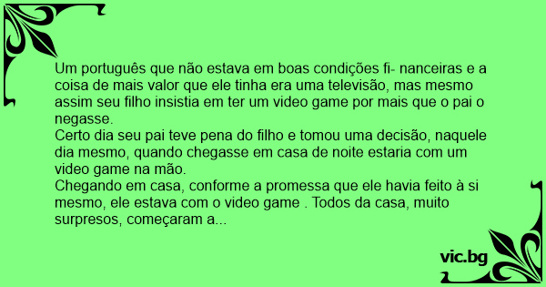 Um português que não estava em boas condições fi- nanceiras e a coisa de mais valor que ele tinha era uma televisão, mas mesmo assim seu filho insistia em ter um video game por mais que o pai o negasse.