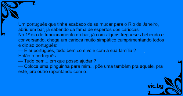 No 1º dia de funcionamento do bar, já com alguns fregueses bebendo e conversando, chega um carioca muito simpático cumprimentando todos e diz ao português: