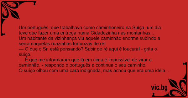 — É que me informaram que lá em cima é impossível de virar o caminhão. - responde o português e continua o seu caminho.