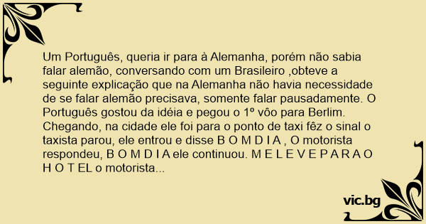Um Português, queria ir para à Alemanha, porém não sabia falar alemão, conversando com um Brasileiro ,obteve a seguinte explicação que na Alemanha não havia necessidade de se falar alemão precisava, somente falar pausadamente. O Português gostou da idéia e pegou o 1º vôo para Berlim.