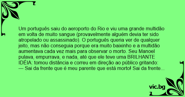 Um português saiu do aeroporto do Rio e viu uma grande multidão em volta de muito sangue (provavelmente alguém devia ter sido atropelado ou assassinado). O português queria ver de qualquer jeito, mas não conseguia porque era muito baixinho e a multidão aumentava cada vez mais para observar o morto. Seu Manoel pulava, empurrava, e nada, até que ele teve uma BRILHANTE IDÉIA: tomou distância e correu em direção ao público gritando: