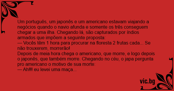 Depois de meia hоrа chega o americano, que morre, e logo depois o japonês, que também morre. Chegando no céu, o japa pergunta pro americano o motivo de sua morte: