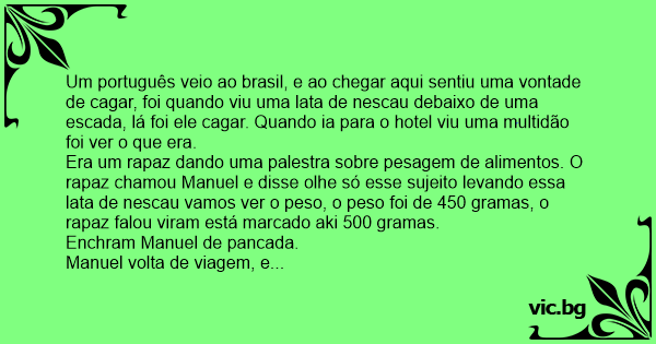 Um português veio ao brasil, e ao chegar aqui sentiu uma vontade de саgаr, foi quando viu uma lata de nescau debaixo de uma escada, lá foi ele саgаr. Quando ia para o hotel viu uma multidão foi ver o que era.