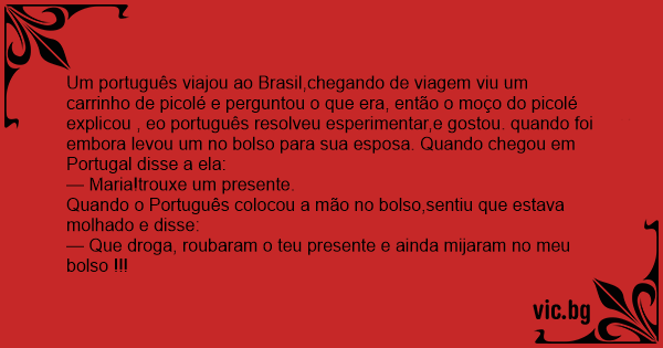 Um português viajou ao Brasil,chegando de viagem viu um carrinho de picolé e perguntou o que era, então o moço do picolé explicou , eo português resolveu esperimentar,e gostou. quando foi embora levou um no bolso para sua esposa. Quando chegou em Portugal disse a ela: