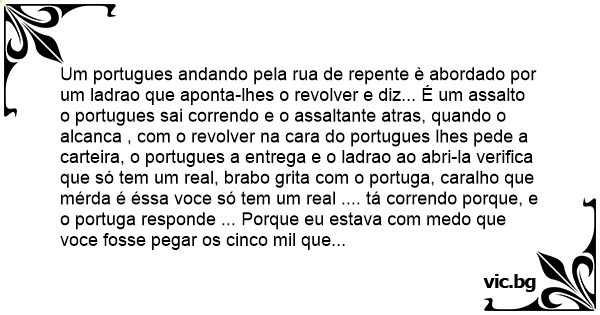 Um portugues andando pela rua de repente è abordado por um ladrao que aponta-lhes o revolver e diz... É um assalto o portugues sai correndo e o assaltante atras, quando o alcanca , com o revolver na cara do portugues lhes pede a carteira, o portugues a entrega e o ladrao ao abri-la verifica que só tem um real, brabo grita com o portuga, саrаlhо que mérda é éssa voce só tem um real .... tá correndo porque, e o portuga responde ... Porque eu estava com medo que voce fosse pegar os cinco mil que eu tenho aqui na minha meia.