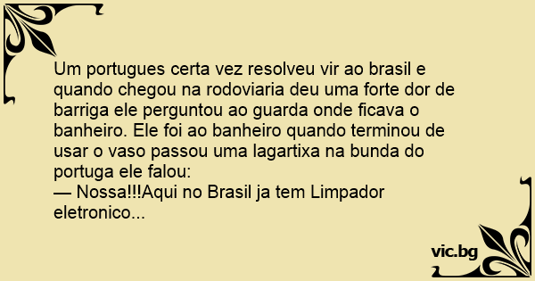 Um portugues certa vez resolveu vir ao brasil e quando chegou na rodoviaria deu uma forte dor de barriga ele perguntou ao guarda onde ficava o banheiro. Ele foi ao banheiro quando terminou de usar o vaso passou uma lagartixa na bunda do portuga ele falou: