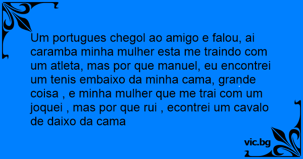 Um portugues chegol ao amigo e falou, ai caramba minha mulher esta me traindo com um atleta, mas por que manuel, eu encontrei um tenis embaixo da minha cama, grande coisa , e minha mulher que me trai com um joquei , mas por que rui , econtrei um cavalo de daixo da cama