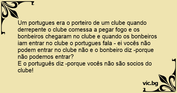Um portugues era o porteiro de um clube quando derrepente o clube comessa a pegar fogo e os bonbeiros chegaram no clube e quando os bonbeiros iam entrar no clube o portugues fala - ei vocês não podem entrar no clube não e o bonbeiro diz -porque não podemos entrar?