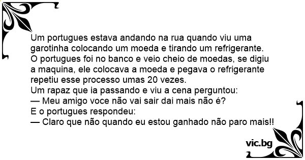 O portugues foi no banco e veio cheio de moedas, se digiu a maquina, ele colocava a moeda e pegava o refrigerante repetiu esse processo umas 20 vezes.