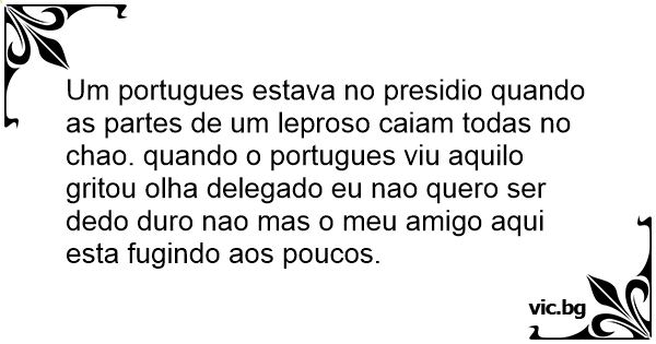 Um portugues estava no presidio quando as partes de um leproso caiam todas no chao. quando o portugues viu aquilo gritou olha delegado eu nao quero ser dedo durо nao mas o meu amigo aqui esta fugindo aos poucos.