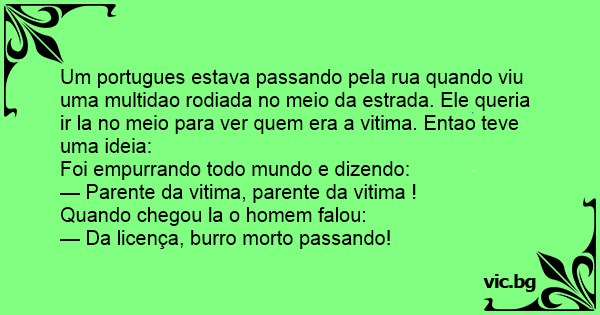 Um portugues estava passando pela rua quando viu uma multidao rodiada no meio da estrada. Ele queria ir la no meio para ver quem era a vitima. Entao teve uma ideia:
