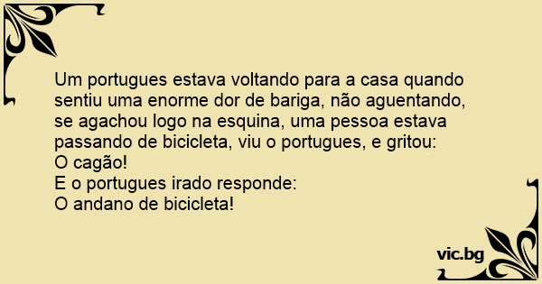 Um portugues estava voltando para a casa quando sentiu uma enorme dor de bariga, não aguentando, se agachou logo na esquina, uma pessoa estava passando de bicicleta, viu o portugues, e gritou: