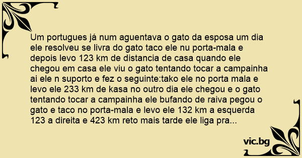 Um portugues já num aguentava o gato da esposa um dia ele resolveu se livra do gato taco ele nu porta-mala e depois levo 123 km de distancia de casa quando ele chegou em casa ele viu o gato tentando tocar a campainha ai ele n suporto e fez o seguinte:tako ele no porta mala e levo ele 233 km de kasa no outro dia ele chegou e o gato tentando tocar a campainha ele bufando de raiva pegou o gato e taco no porta-mala e levo ele 132 km a esquerda 123 a direita e 423 km reto mais tarde ele liga pra mulher dele Manuel: