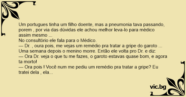 Um portugues tinha um filho doente, mas a pneumonia tava passando, porem , por via das dúvidas ele achou melhor leva-lo para médico assim mesmo ...